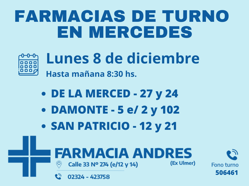 Desde las 8:30 del día de hoy hasta la misma hora de mañana, las farmacias de turno en Mercedes son: De La Merced, Damonte y San Patricio