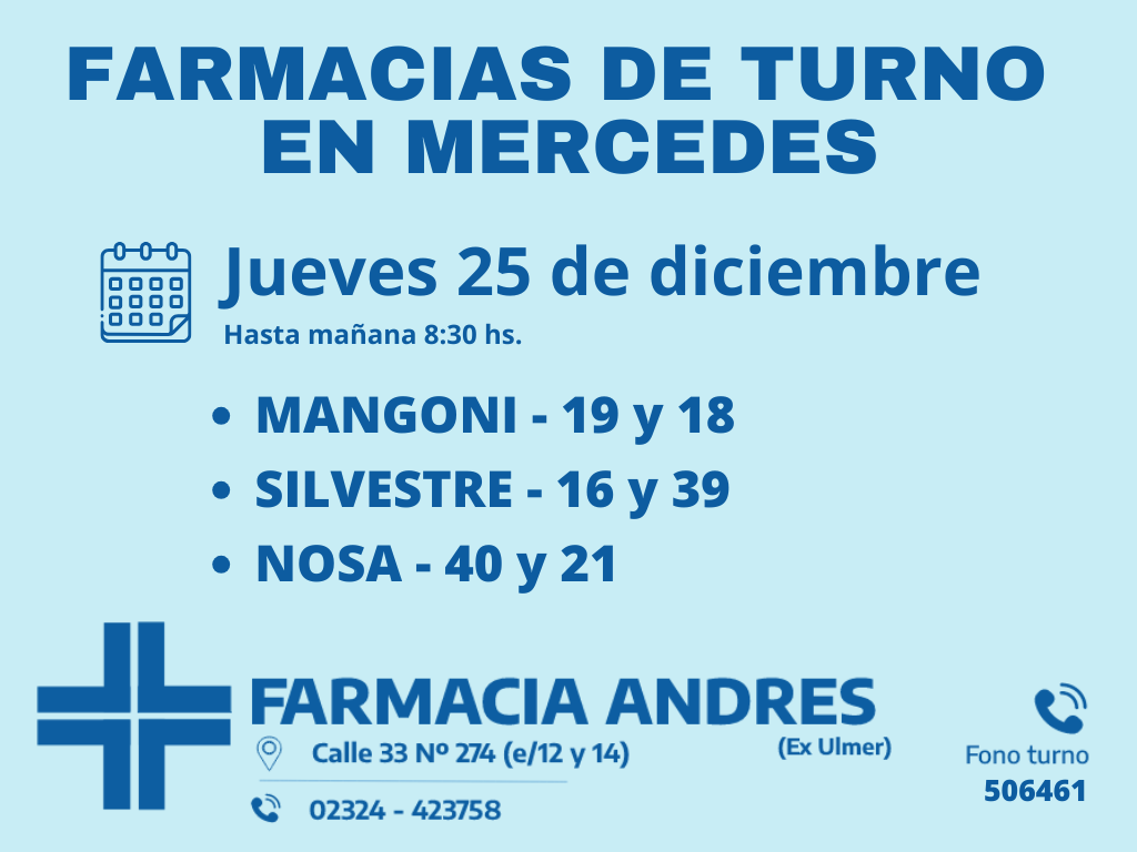 Desde las 8 30 del día de hoy hasta la misma hora de mañana las farmacias de turno en Mercedes son Mangoni, Nosa y Silvestre