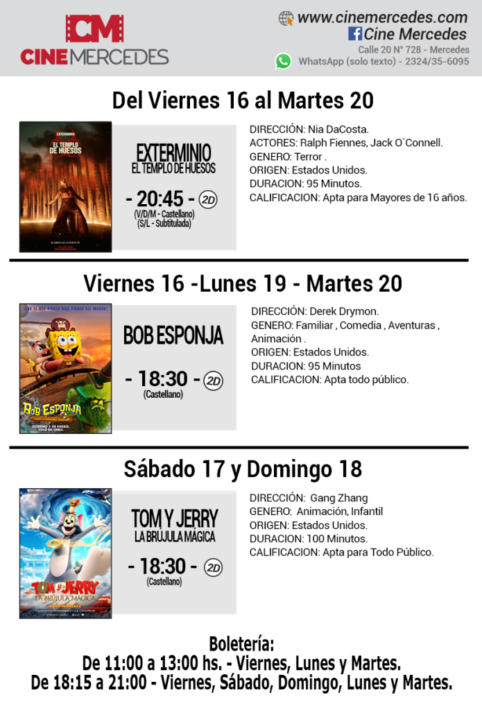 Desde el viernes 16 al martes 20 de enero, el Cine Mercedes presenta tres opciones en su gran pantalla. Exterminio en las funciones de las 20:45 hs, mientras que para los más pequeños, podrán optar entre Bob Esponja y Tom y Jerry