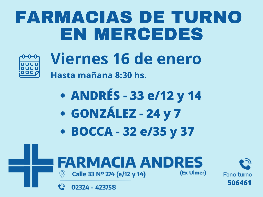 Desde las 8 30 del día de hoy hasta la misma hora de mañana las farmacias de turno en Mercedes son: Andrés, Gonzalez y Bocca.