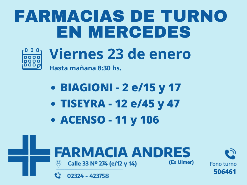 Desde las 8:30 del día de hoy hasta la misma hora de mañana, las farmacias de turno en Mercedes son: Biagioni, Tiseyra y Acenso.