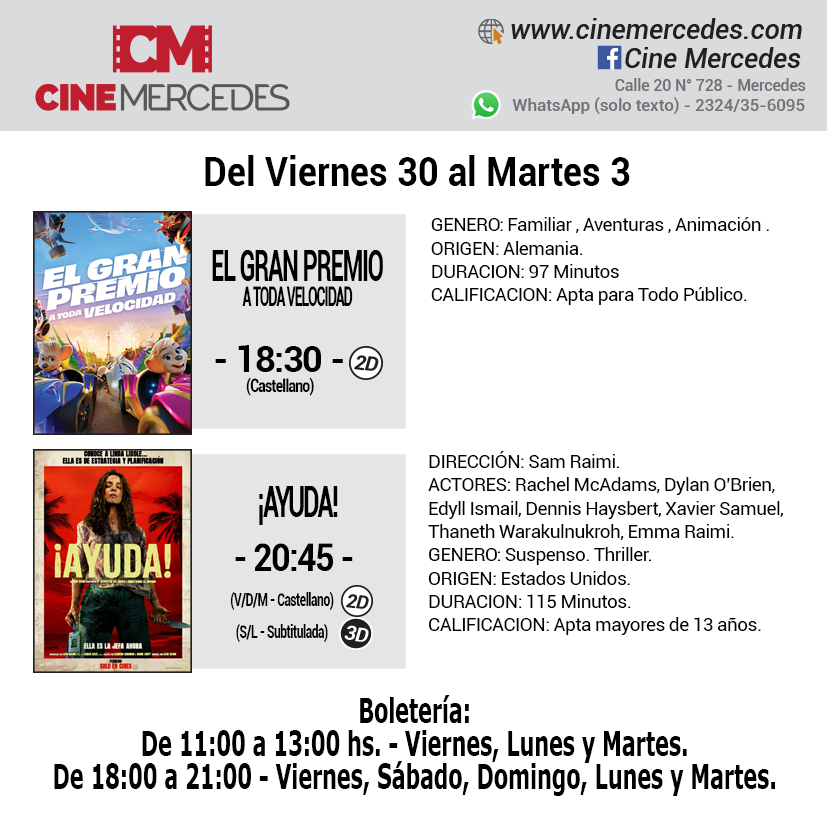Desde el viernes 30 de enero al martes 3 de febrero, se presenta en la pantalla local del Cine Mercedes dos películas. Una familiar y de animación, en tanto para los más grandes se puede ver un thriller. «El Gran Premio a Toda Velocidad» en las funciones de las 18:30 hs, mientras que «¡Ayuda!» en la función de las 20:45 hs.