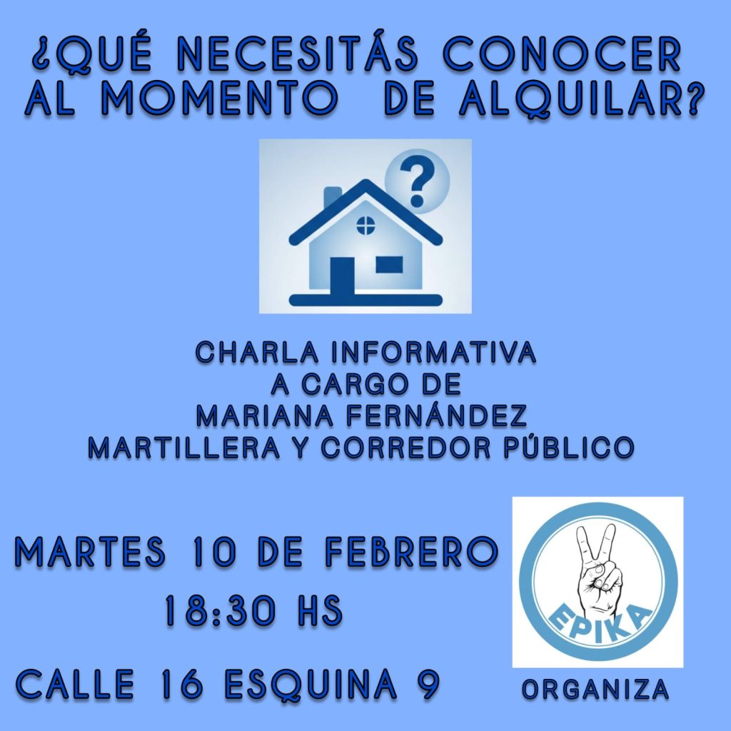 Desde la agrupación Epika Mercedes, ubicada en calle 16 esquina 9, el dia martes 10 de febrero a las 18:30 hs se realizará una charla sobre alquileres, a cargo de la martillera Mariana Fernández.