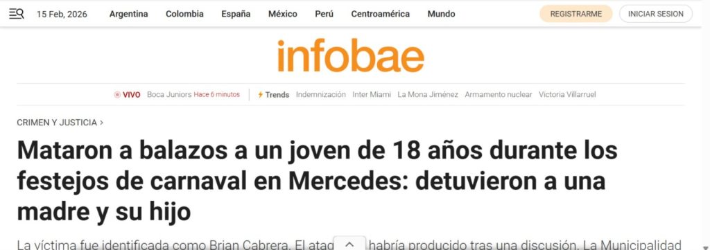 La muerte del joven Brian Cabrera, de 18 años, abatido a balazos en plena celebración de carnaval en la ciudad de Mercedes, generó una cobertura amplia en medios nacionales de Argentina. Las crónicas dieron cuenta no sólo del hecho en sí, sino también de las reacciones oficiales, policiales y sociales que surgieron a partir del episodio, que interrumpió una festividad tradicional y despertó debates sobre la seguridad en eventos masivos en el país.
