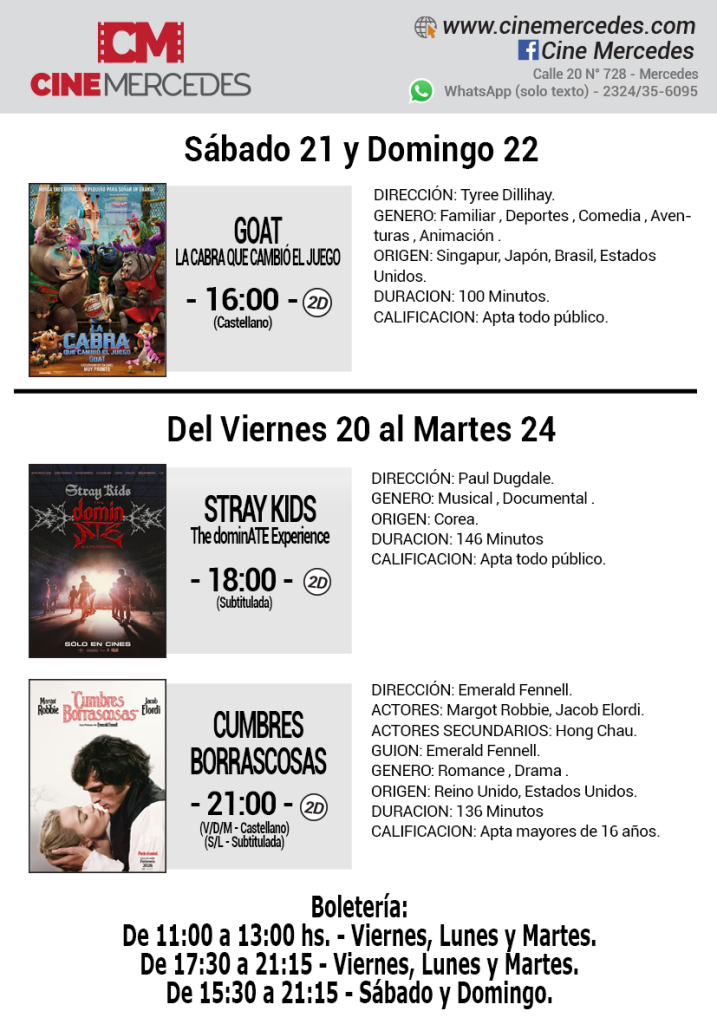 Desde el viernes 20 al martes 24 de febrero, el Cine Mercedes presenta películas de estreno en el país, esperadas por diversos públicos. Llega a la pantalla local la adaptación cinematográfica de «Cumbres Borrascosas», el documental y concierto de Stray Kids y el film de animación «GOAT»