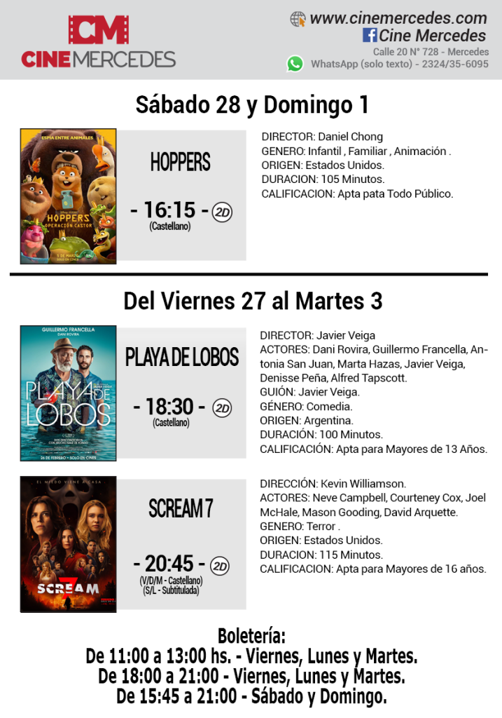 El Cine Mercedes presenta en su pantalla una cartelera con estrenos y un preestreno. Desde el viernes 27 de febrero, al martes 3 de marzo, podrá verse en la sala local: la película española que tiene como protagonista a Gillermo Francella, «Playa de Lobos» y la nueva de la saga «Scream». Asimismo, este fin de semana se realizará el pre estreno del film de animación «Hoppers»