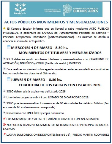 El acto público será a partir de las 8:30 hs. Podrán asistir a la sede del Consejo Escolar (ex- Instituto Martín Rodríguez ingresando por la puerta de calle 6 y 9) quienes estén en el listado 2026 de titulares y mensualizados que quieran realizar movimientos de su cargo actual.