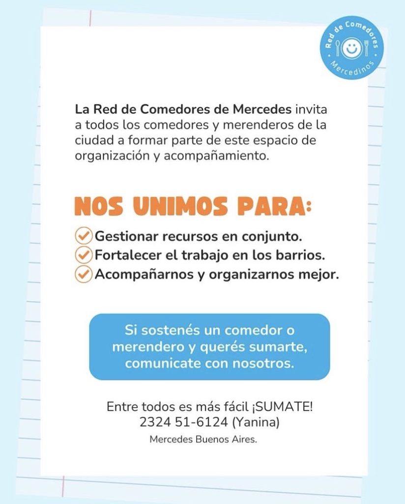 Referentes sociales impulsan en la ciudad de Mercedes la creación de una red estratégica que articule el trabajo de comedores y merenderos, con el objetivo de fortalecer la organización comunitaria y mejorar la asistencia alimentaria en distintos barrios.