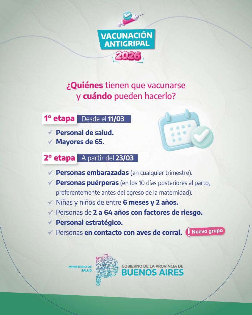 Desde distintos organismos e instituciones sanitarias difunden y recuerdan la importancia de la vacunación antigripal que en la provincia de Buenos Aires comienza este miércoles. Desde el 11 de marzo, se podrán vacunar Mayores de 65 años y el Personal de Salud. En una segunda etapa, a partir del 23 de marzo, se vacunará a personas embarazadas, puérpereas, bebes y niños de entre 6 meses y 2 años, personas menores de 64 años con factores de riesgo y personas que tengan contacto con aves de corral (un nuevo grupo que se suma en esta campaña)