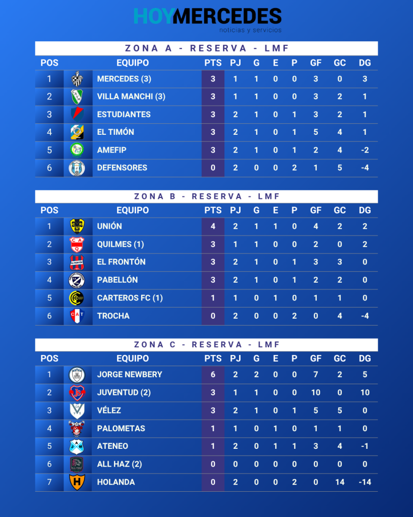 La lluvia reinante del fin de semana dejó inertes algunas de las canchas que conforman el fútbol grande de la ciudad, dejando los encuentros entre Quilmes vs Carteros y Juventud de Suipacha vs All Haz suspendidos en Primera, mientras que en Reserva a esos dos se les sumó Villa Manchi ante Club Mercedes. Libre quedó Palometas