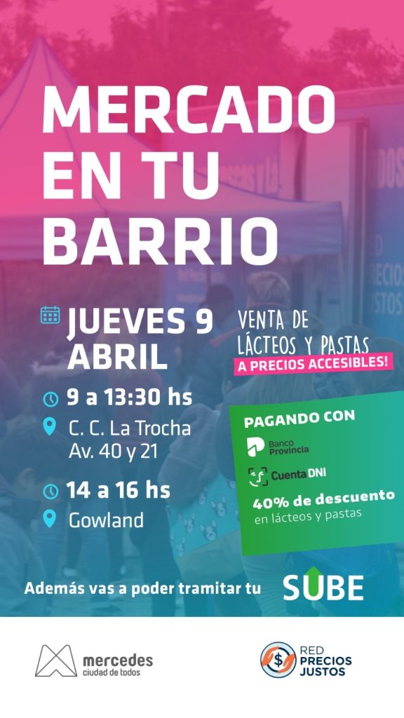 La Municipalidad de Mercedes confirmó una nueva edición del programa itinerante «Mercado en tu Barrio» para este jueves 9 de abril. La iniciativa, que busca acercar productos de primera necesidad a precios mayoristas, contará con la participación de la Red Precios Justos, especializada en lácteos y pastas frescas.