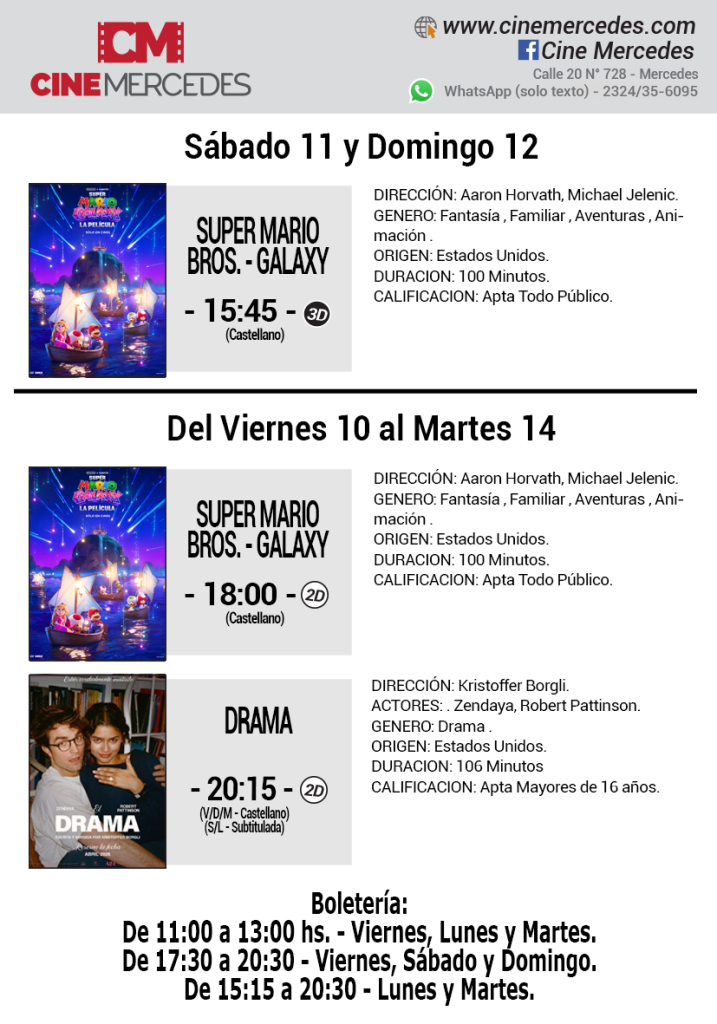 El Cine Mercedes presenta entre el viernes 10 y el martes 14 de abril presenta en su gran pantalla, dos películas. Super Mario Bros sigue en la pantalla y suma a «Drama», película protagonizada por Zendaya y Robert Pattinson.