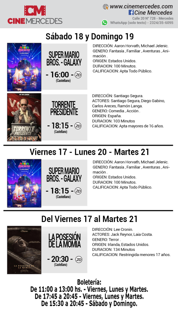 Desde el viernes 17 de abril, el Cine Mercedes presenta en su cartelera tres películas en distintos horarios para todo público. Hasta el martes 21 podrá verse «Super Mario Bros – Galaxy» y el film de terror «La Posesión de la Momia». El sábado y domingo se suma «Torrente Presidente», una nueva película de la saga del detective español con acción y comedia.