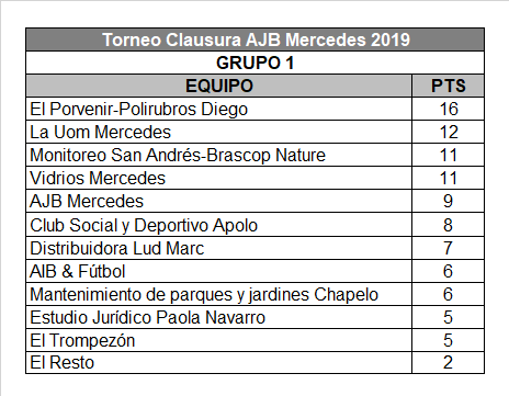 Por último, se registraron dos igualdades. Una fue dos a dos entre Club Social y Deportivo Apolo contra Mantenimiento de parques y jardines Chapelo. La otra, fue uno a uno, pero jugaron entre sí Estudio Jurídico Paola Navarro y El Trompezón.