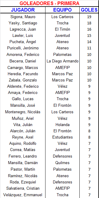 | Ateneo | 3 | Nicolás Ramírez (2) y Leonardo Chaparro |