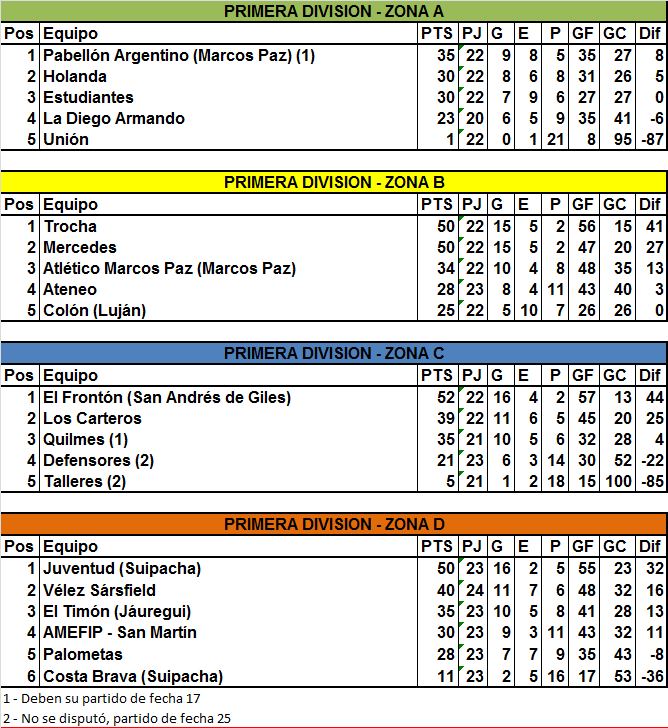 En la D, Juventud se aseguró el primer puesto. Vélez, para ser segundo, deberá ganar el partido que le queda ó esperar que El Timón no gane los dos que tiene por delante, ya que si empatan en 41, por los partidos entre sí, quedarían segundo los de Jáuregui, que ya están clasificados. Sin embargo, por el tercer puesto, si El Timón sólo suma uno y AMEFIP 6, al quedar empatados en los partidos entre sí, la diferencia de gol será la que se deba evaluar. Los de Jáuregui, con dos puntos son terceros.