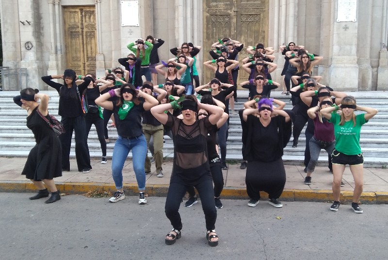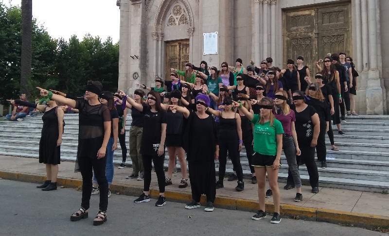 Tras un ensayo, se acomodaron en hileras en el atrio de la Catedral y con los ojos vendados hicieron dos representaciones del himno contra la violencia hacia la mujer que repite en su estribillo «El Violador eres Tu» y marca la complicidad de la Policía, la Iglesia, los Jueces y el Estado ante el maltrato a las mujeres y los femicidios.