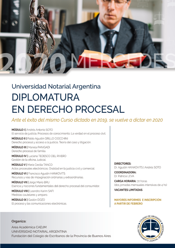 El viernes 3 de abril comenzará la Diplomatura en Derecho Procesal que el Colegio de Abogados del Departamento Judicial Mercedes lleva adelante con la Universidad Notarial Argentina y la Fundación del Colegio de Escribanos de la provincia de Buenos Aires. Las inscripciones están abiertas ya que los cupos son limitados. Para mayor información, los interesados pueden comunicarse con el Colegio de Abogados o ver aquí: