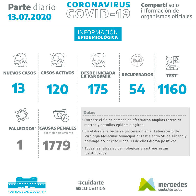 «Tras un fin de semana de arduo trabajo del SAME, el Hospital Dubarry, personal de la Secretaría de Salud y el Centro de Tele Seguimiento se efectuaron 77 testeos correspondientes 50 a sábado y domingo y 27 a este lunes de los cuales 13 resultaron positivos para covid-19. Los detectados en la jornada de la fecha permiten arribar a 120 los casos activos en Mercedes con un total de 175 desde iniciada la pandemia. Además se informa la excelente noticia de que 6 vecinos y vecinas fueron dados de alta tras finalizar el tratamiento llegando a un total de 54 recuperados desde iniciada la pandemia. Los test arriban a un total de 1160 desde iniciado el desencadenamiento en el país», expresa el informe oficial.