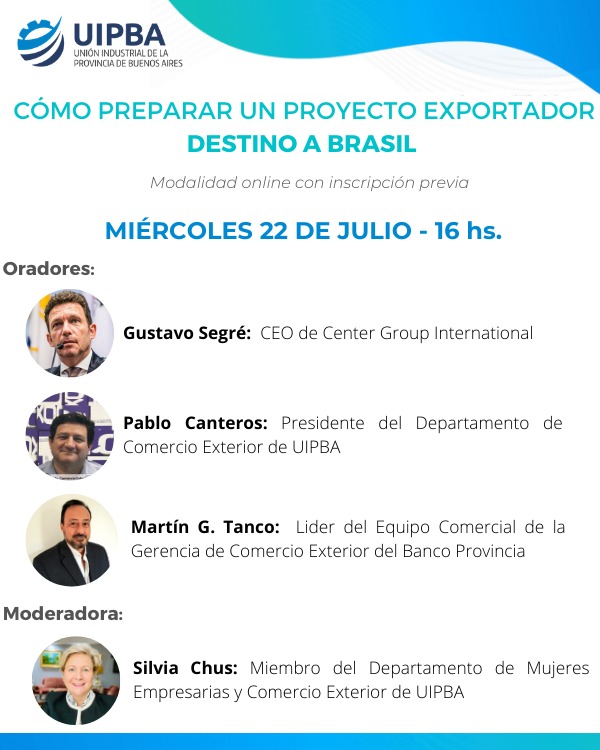 Una nueva propuesta formativa para empresas e industrias mercedinas llega a través de la Unión Industrial de la Provincia de Buenos Aires. “Como preparar un proyecto exportador, destino Brasil” se denomina y tendrá un destacado panel online. Inicia a las 16hs este miércoles 22 de julio y requiere inscripción.