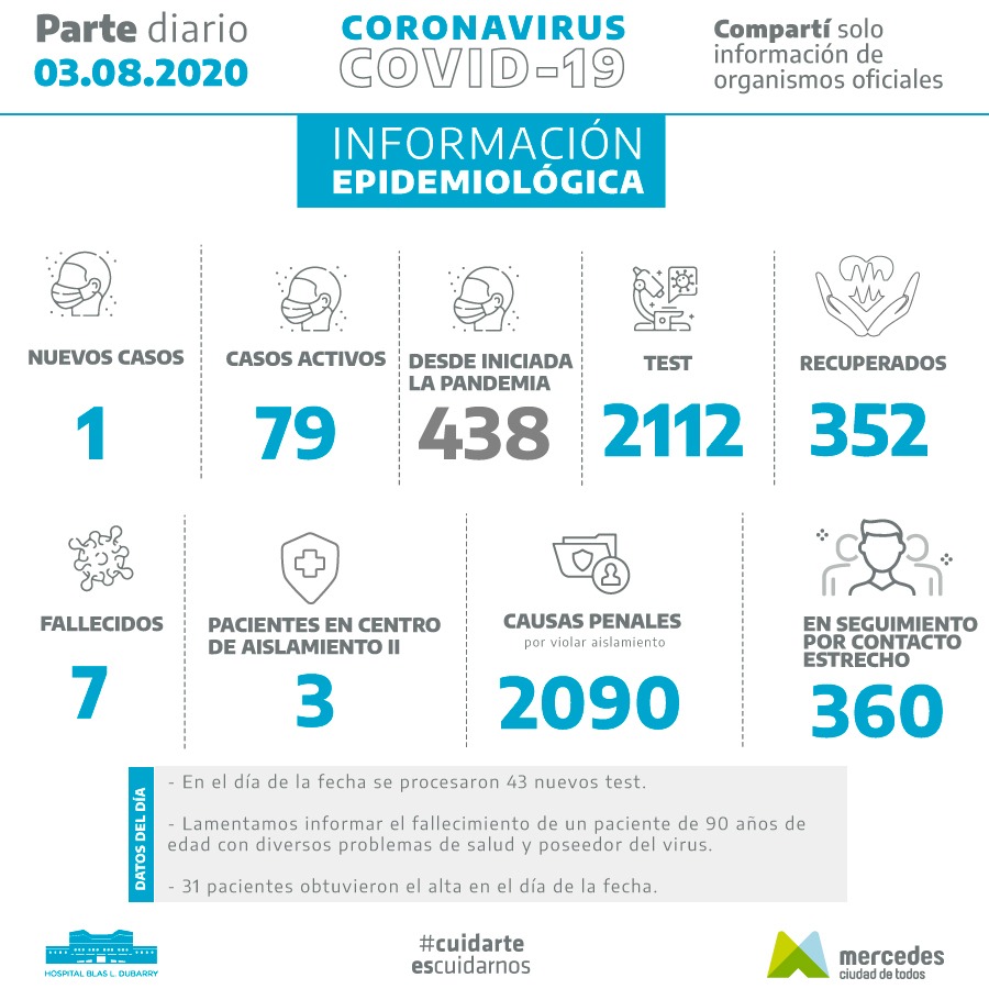 El cierre del día en cuanto a la situación epidemiológica en Mercedes informa que se sumó un nuevo paciente con covid-19 en la ciduad. Aunque, lamentalemente falleció el hombre de 90 años, residente del Villa Abrille que era portador del virus y de una compleja patología de base.