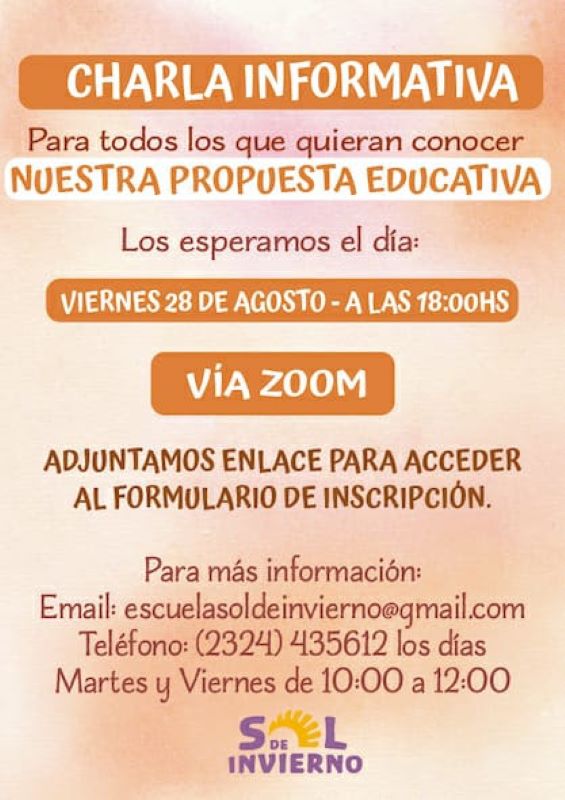 La comunidad de maestros, padres, madres y amigos del Jardín/Escuela Sol de Invierno, invitan a todos/as aquellas/as que quieran conocer esta propuesta educativa integral, a conectarse este viernes 28 de agosto a las 18hs. para una charla informativa, que se realizará a través de la plataforma ZOOM.
