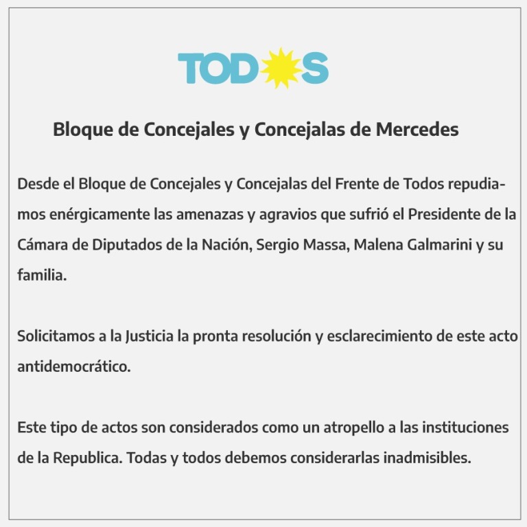 El bloque de Concejales y Concejalas del Frente de Todos de la ciudad de Mercedes, «repudian enérgicamente las amenazas y agravios que sufrió el Presidente de la Cámara de Diputados de la Nación, Sergio Massa, Malena Galmarini y su familia».