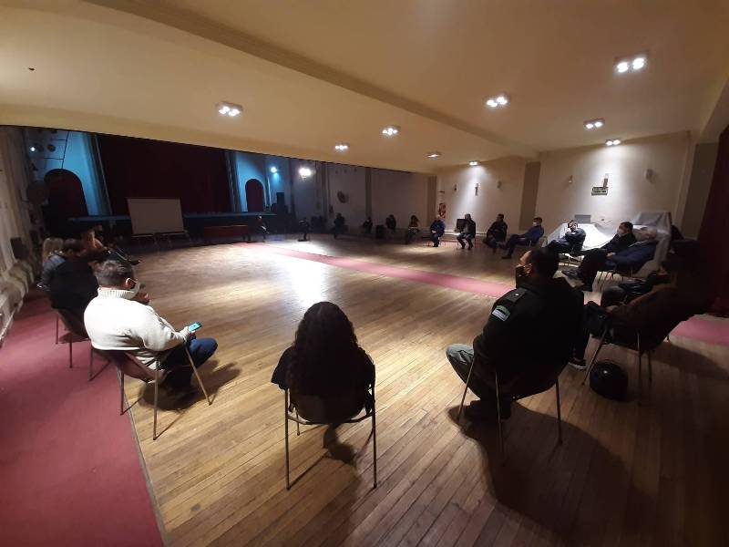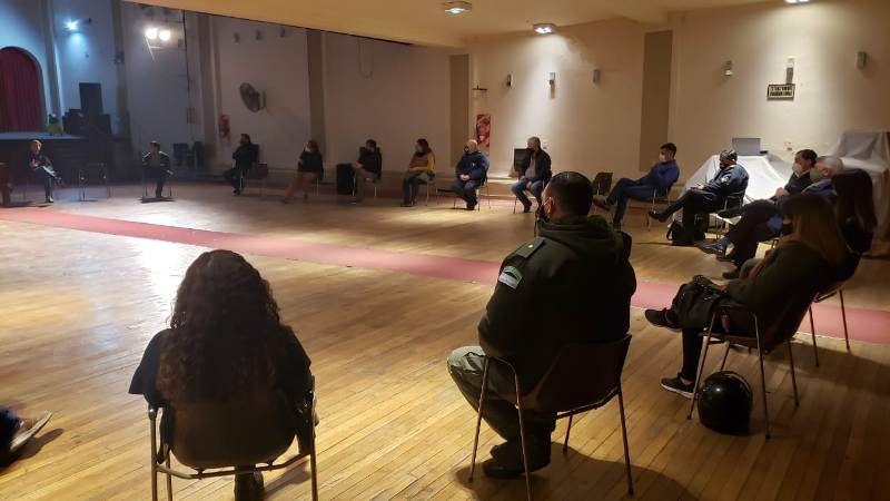 En la reunión realizada en la plata baja del teatro, están presentes las autoridades comunales, concejales, representantes gremiales, iglesias, organismos de seguridad, estudiantes secundarios, instituciones sociales, civiles y comerciales, organismos nacionales y provinciales y referentes sanitarios.