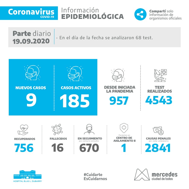 La información oficial de Mercedes en cuanto a la situación epidemiológica sobre el covid-19 confirma que 9 pacientes se suman con la enfermedad que preocupa al mundo. En la jornada de este sábado se analizaron 68 hisopados.