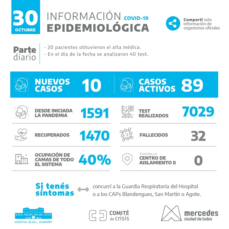 Al día de la fecha tenemos 89 casos activos con 20 altas médicas. Por su parte 1591 casos se registraron desde iniciada la pandemia con 1470 pacientes recuperados del virus.