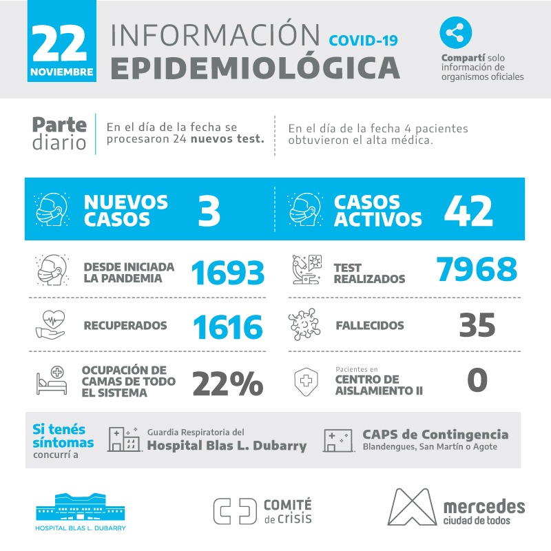 La información epidemiológica enviada por las autoridades sanitarias afirma que este domingo 3 nuevos casos positivos de covid-19 se suman en Mercedes entre los 24 test realizados en el día de la fecha. Además, este domingo 4 pacientes recibieron el alta médica tras cumplir con los protocolos establecidos de atención clínica.