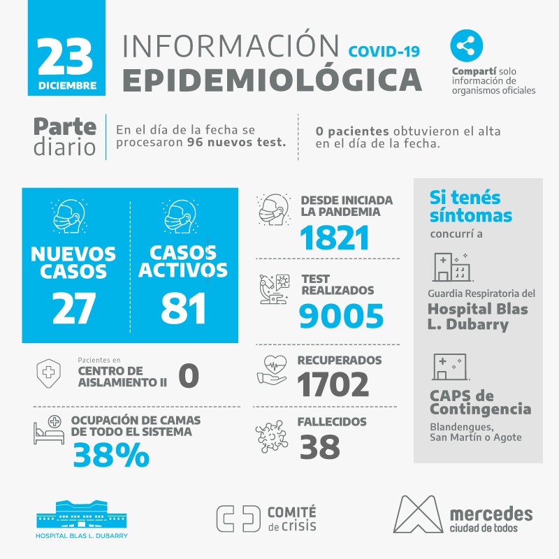 La información epidemiológica de este miércoles confirma 27 nuevos positivos de covid-19 en Mercedes. Con este número, a la fecha son 81 pacientes con el virus de manera activa, y 1821 pacientes que transitaron la enfermedad confirmados por las autoridades sanitarias.