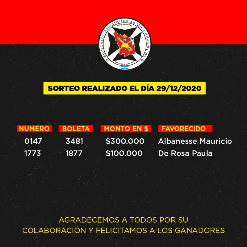 El pasado martes 29 de diciembre, a la noche, los Bomberos Voluntarios de Mercedes realizaron el sorteo extraordinario del bono complementario entregado a quienes cancelaron la totalidad de las cuotas del bono contribución 2020. Los ganadores fueron: Mauricio Albanesse y Paula De Rosa.