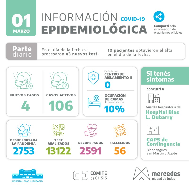 El informe epidemiológico da cuenta de 43 nuevos análisis procesados en la fecha con 4 casos positivos de covid-19. Además, confirmaron 10 pacientes obtuvieron el alta en el día de la fecha.