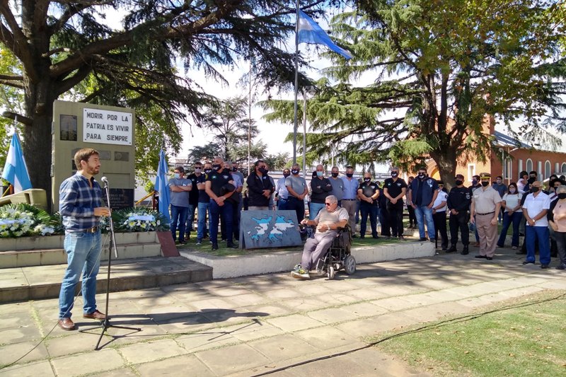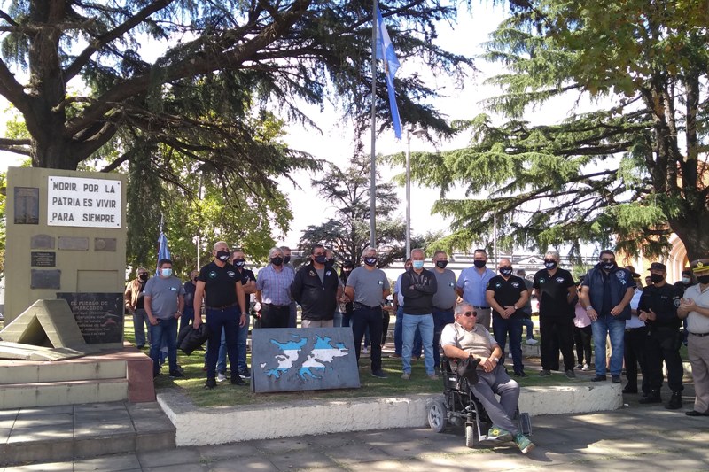 Este 2021, pandemia de por medio, el acto fue más breve y sencillo. Un grupo de veteranos hicieron su entrada al acto aplaudidos por los presentes para ubicarse detrás de la imagen de las islas a un costado del monumento que representa el suelo malvinense.