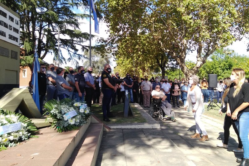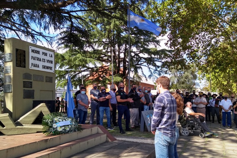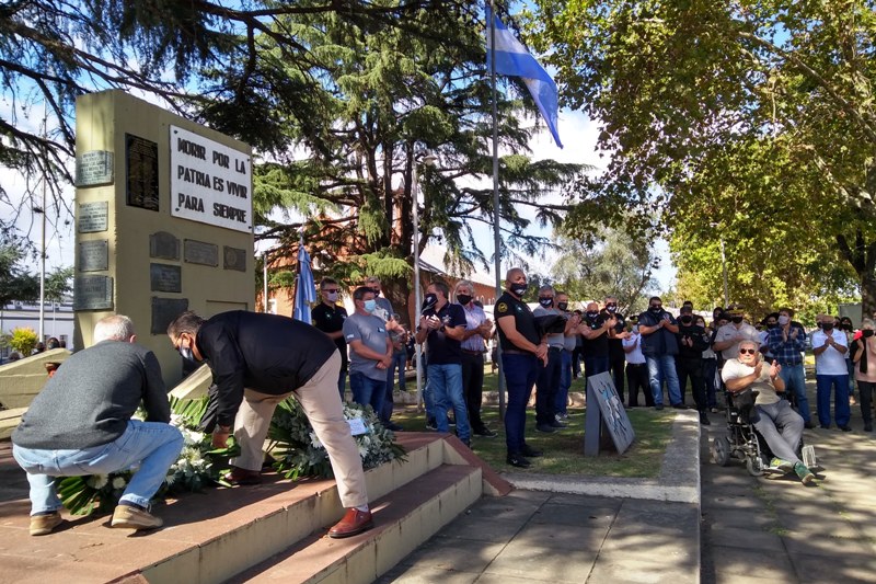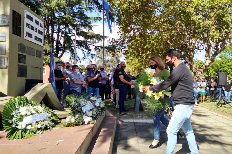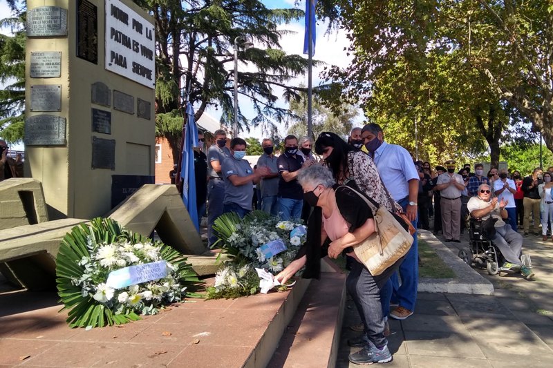 A los pies de es monumento se colocaron las ofrendas florales en nombre del Municipio de Mercedes, del Centro de ex combatientes, del Concejo Deliberante, de madres y familiares de combatientes, de la Unión Cívica Radical y de la UOM.