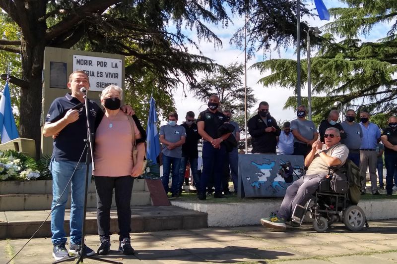 Las palabras en nombre de los combatientes estuvieron a cargo de Walter Castro, quién convocó a su madre y junto a ella homenajeó y destacó las madres de los soldados que fueron a la guerra y en especial a las madres de los soldados que no volvieron, muchos de ellos, enterrados en el Cementerio de Darwin que están siendo identificados por el cuerpo Argentino Forense.