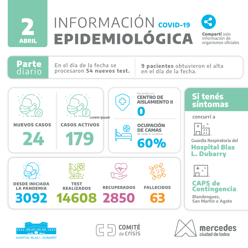 24 nuevos positivos durante la jornada de hoy tras 54 test analizados en el Laboratorio de Virología Molecular. Por su parte, 9 pacientes obtuvieron el alta y 3092 positivos desde el inicio de la pandemia hace casi un año, siendo 2850 los pacientes recuperados, con 14608 testeos realizados hasta la fecha. El informe resalta que la tasa de ocupación de camas en el sistema sanitario local es del 60%.