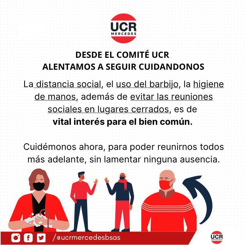 A través de una publicación en sus redes sociales, desde la UCR-Mercedes «alientan» al cuidado en esta segunda ola de COVID. «Sabemos que el esfuerzo realizado por la comunidad ha sido grande y prolongado. Pero dada la situación que atravesamos producto de esta nueva ola con mayor cantidad de contagios en edades cada vez menores, sin haber aún completado la inmunización porcentual necesaria y con un sistema de salud muy comprometido, es que hacemos un llamamiento a cumplir y respetar con las recomendaciones y pedidos generados desde el Municipio y Comité de Crisis», firma la Mesa de Comité- UCR Mercedes Bs As