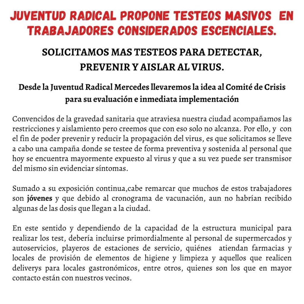 «En este sentido y dependiendo de la capacidad de la estructura municipal para realizar los test, debería incluirse primordialmente al personal de supermercados y autoservicios, playeros de estaciones de servicio, quiénes atiendan farmacias y locales de provisión de elementos de higiene y limpieza y aquellos que realicen delivery para locales gastronómicos, entre otros, quienes son los que en mayor contacto están con nuestros vecinos», concluyen desde la Juventud Radical.
