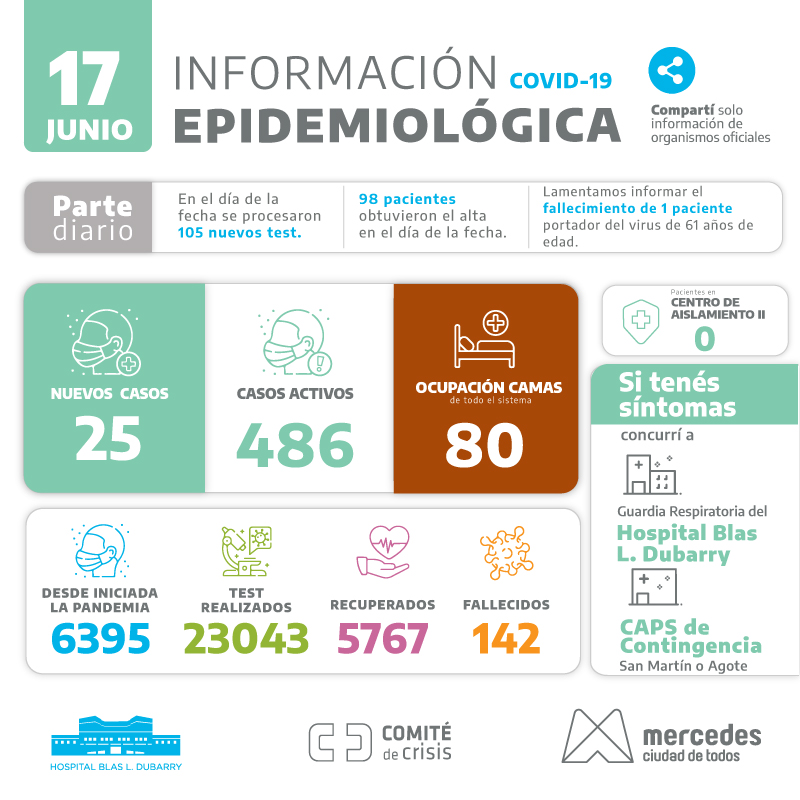 En el cierre del día se lamenta el fallecimiento de 1 paciente portador del virus. A su vez se conoce la detección de 25 nuevos positivos en 105 test efectuados en el laboratorio de virología molecular, siendo el reunionismo el principal factor de contagio.
