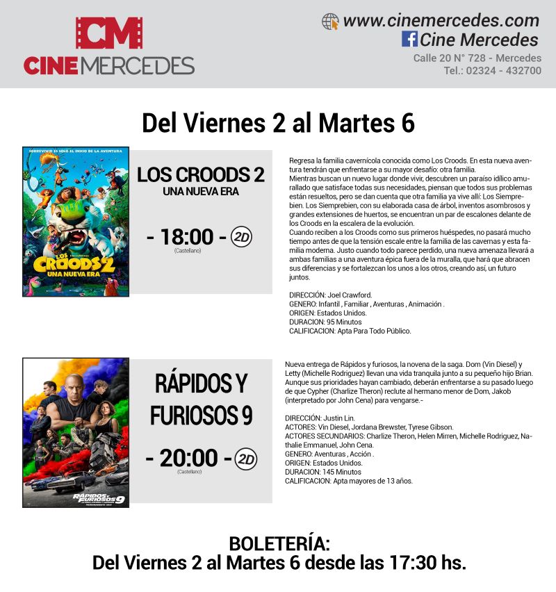 Es así que darán la segunda parte de la película animada de la familia prehistórica Los Croods, en una nueva era. La película ideal para los pequeños se podrá ver a la hora 18. En tanto, para los amantes de la acción, el Cine Mercedes presentará la novena parte de Rápidos y Furiosos. A la hora 20 serán las funciones hasta el martes 6 de julio.