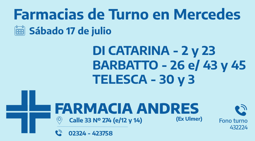 Desde las 8:30 del día de hoy hasta la misma hora de mañana, las farmacias de turno en Mercedes son: Di Catarina, Barbatto y Telesca.