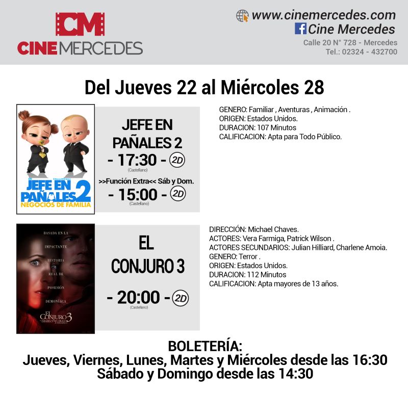 Desde el jueves 22 y hasta el miércoles 28 de julio, el Cine Mercedes continúa con una programación de películas ideales para las vacaciones de invierno. Para los más pequeños, llega a la pantalla local, «Jefe en Pañales 2» (17:30 horas y sábados y domingos 15 hs) y para los amantes del terror, El Conjuro 3 (20 horas). Cabe recordar que las funciones son con aforo del 30% en la salam por lo tanto, se recomienda adquirir las entradas con antelación.
