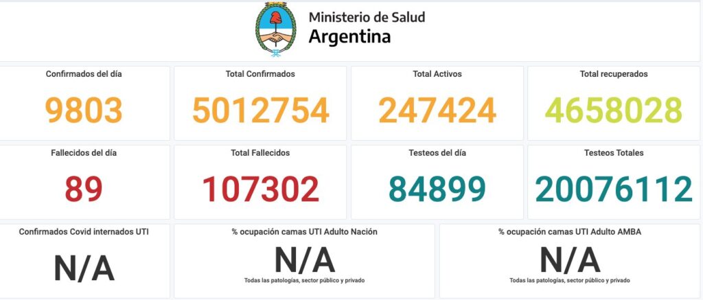 El Ministerio de Salud de la Nación informó este sábado 7 de agosto, el registro de 89 fallecimientos y 9.803 nuevos contagios de coronavirus. Con estas cifras, el total de casos desde el comienzo de la pandemia es de 5.012.754 y los fallecimientos son 107.302.
