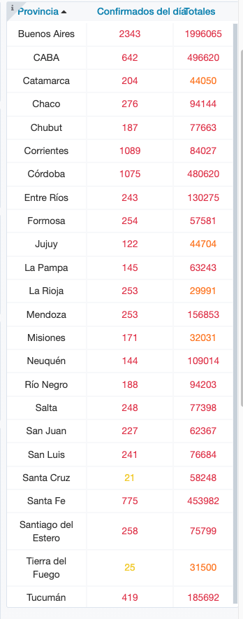 El total de acumulados por distrito indica que la provincia de Buenos Aires suma 1.996.065 casos; la Ciudad de Buenos Aires, 496.620; Catamarca, 44.050; Chaco, 94.144; Chubut, 77.663; Corrientes, 84.027; Córdoba, 480.620; Entre Ríos, 130.275; Formosa, 57.581; Jujuy, 44.704; La Pampa, 63.243; La Rioja, 29.991; Mendoza, 156.853; Misiones, 32.031; Neuquén, 109.014; Río Negro, 94.203; Salta, 77.398; San Juan, 62.367; San Luis, 76.684; Santa Cruz, 58.248; Santa Fe, 453.982; Santiago del Estero, 75.799; Tierra del Fuego, 31.500 y Tucumán, 185.692.