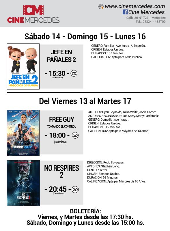 El Cine Mercedes presentará entre el viernes 13 y el martes 17 de agosto, tres películas, de las cuáles dos son estrenos. Por un lado, en la función de la hora 18, llega la comedia «Free Guy. Tomando el Control»; mientras que en la función de la hora 20:45 los amantes del terror podrán ver «No Respires 2». También, los más pequeños podrán disfrutar durante el fin de semana largo, «Jefe en Pañales 2» que sigue en cartelera una semana más en la función de la hora 15:30 los días sábado 14, domingo 15 y lunes 16.