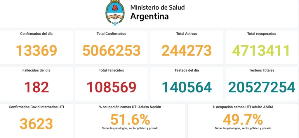 El Ministerio de Salud de la Nación informó este jueves 12 de agosto que se registraron 182 muertes y 13.369 nuevos contagios de coronavirus. El total de casos desde el comienzo de la pandemia ascendió a 5.066.253 y los fallecimientos son 108.569.