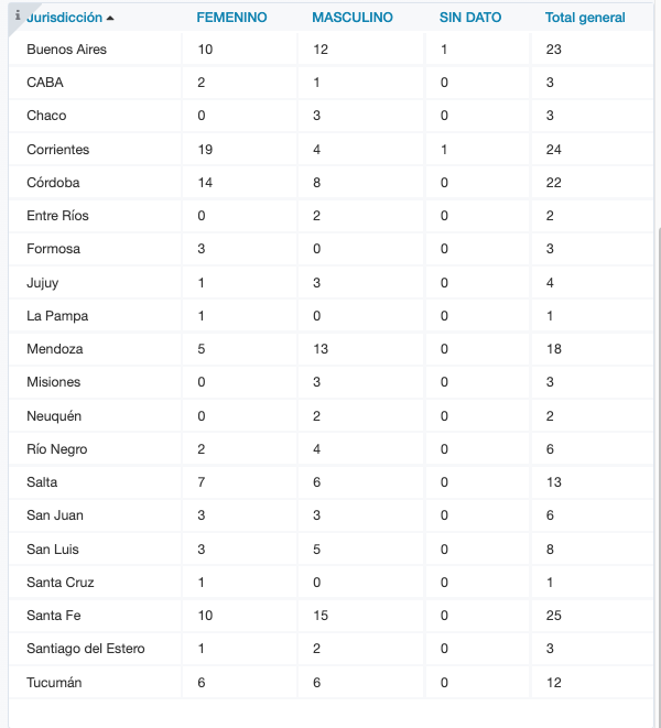 El parte precisó que murieron doce hombres en la provincia de Buenos Aires; uno en la Ciudad de Buenos Aires; tres en Chaco; cuatro en Corrientes; ocho en Córdoba; dos en Entre Ríos; tres en Jujuy; trece en Mendoza; tres en Misiones; dos en Neuquén; cuatro en Río Negro; 6 en Salta; tres en San Juan; cinco en San Luis; quince en Santa Fe; dos en Santiago del Estero; y seis en Tucumán.