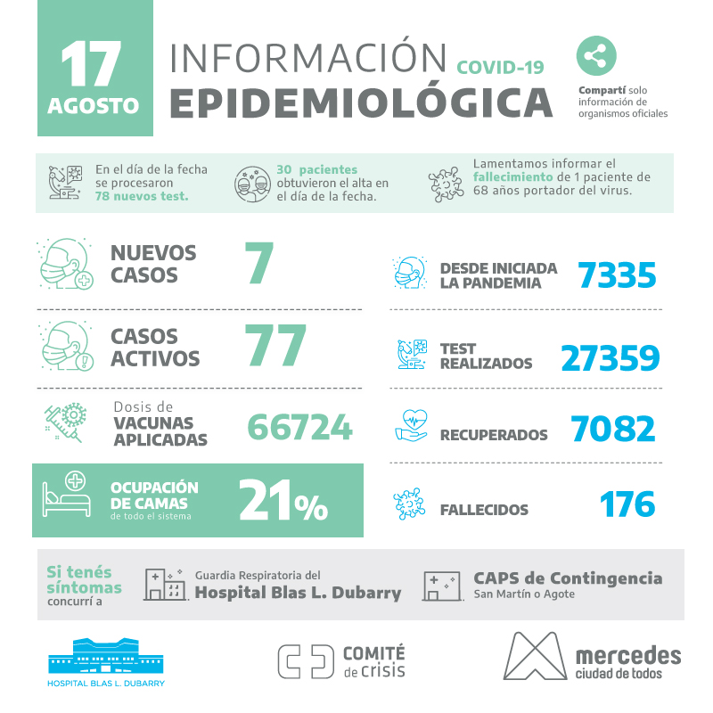 En el día de la fecha lamentamos informar el fallecimiento de un paciente de 68 años de edad. A su vez se registraron 7 caso positivo en los 78 test realizados.